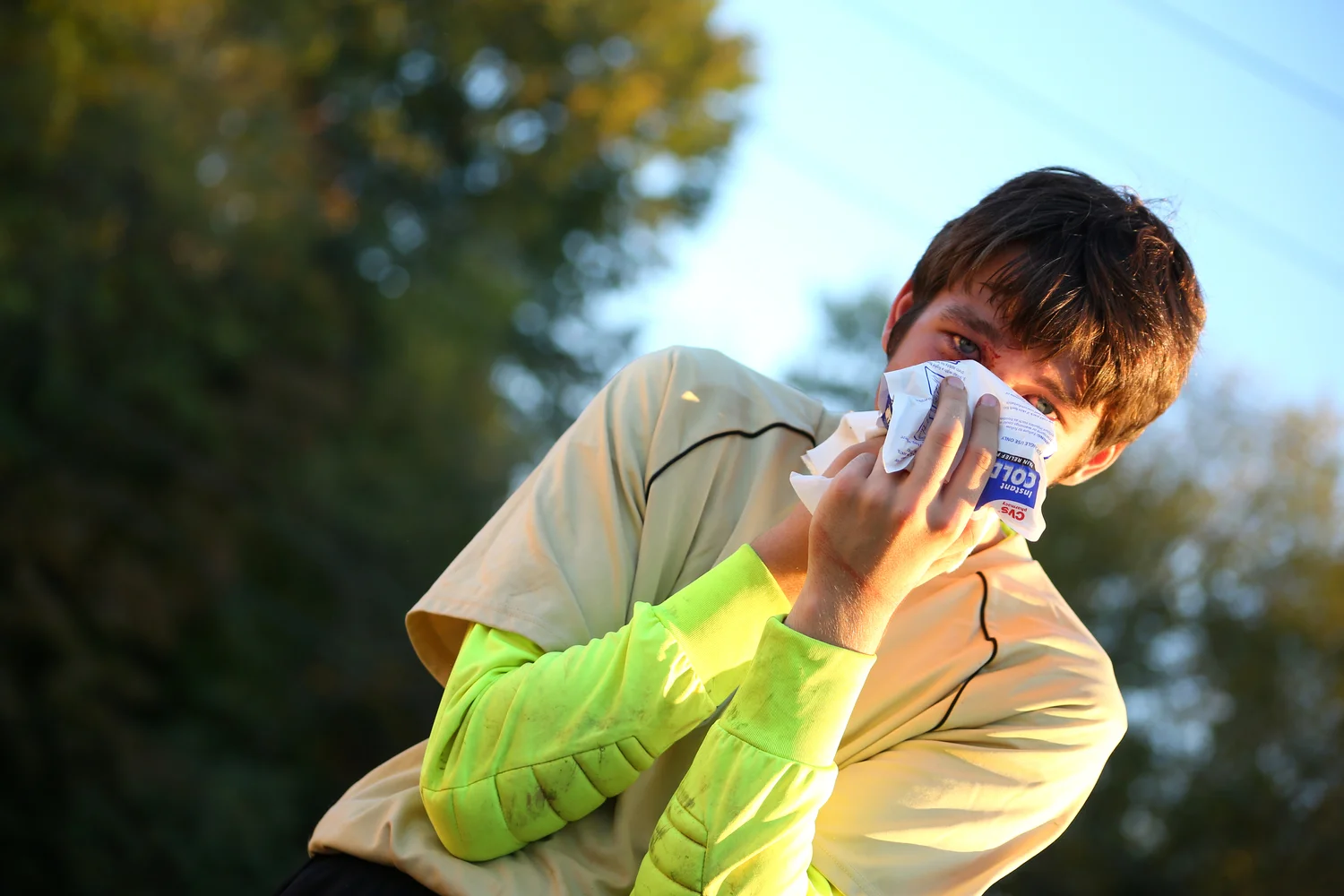 A boy clutches his nose at a soccer game after being kicked while saving a goal.